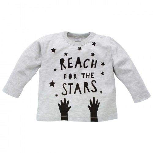 Mehka in udobna otroška majica Happy day v sivi barvi in napisom Reach for the stars.