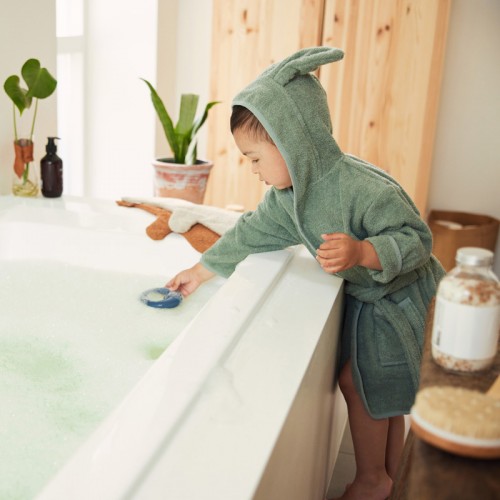 Kopalni plašč v pepelnato zeleni barvi iz 100% frotirja je popoln za po kopeli, tuširanju ali plavanju. Mehak frotir zlahka vpija vlago in omogoča, da je vašemu malčku prijetno toplo. Zabavna kapuca z ušesi bo zaščitila mokro glavo.