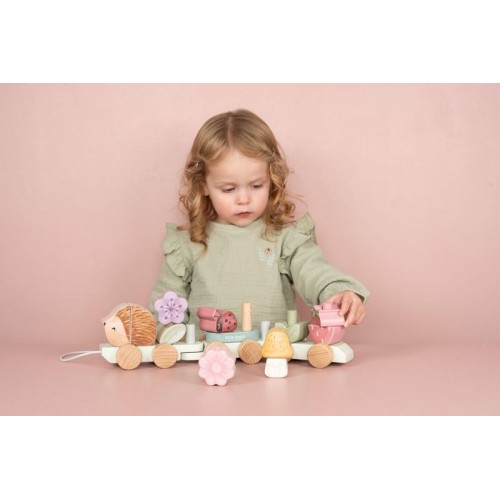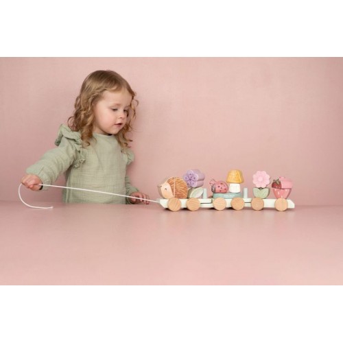 Čudovit lesen vlak je z ježkom in prijatelji pripravljen na novo dogodivščino. Vlak ima tri vagone na katere lahko malčki nataknejo kocke različnih oblik in barv in sestavijo ježka,rožico, gobico, jagodo in pikapolonico. Igrača, ki poleg zabave, spodbuja razvoj fine motorike in koordinacijo oko-roka.