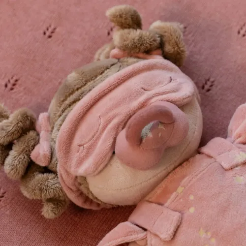 Spoznajte Roso, mehko dojenčico za "crkljanje" z vašo malčico/malčkom. Z njeno ljubko dudo, spalno masko in udobno spalno vrečo z luno in zvezdicami, ki se svetijo v temi, postane čas za spanje čaroben trenutek. Njeno otroško posteljico in plenico lahko malček obleče ali sleče kar spodbuja razvoj fine motorike, potrpežljivost in vztrajnost.