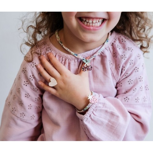 Komplet Češnje vsebuje ogrlico, zapestnico in prstan s čudovitim samorogom in bleščečimi zvezdicami, izdelane iz mehkega materiala in bleščečih tkanin. Velikost kompleta je primerna za otroke od 3 do 10 let.