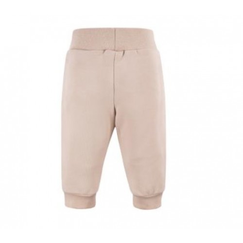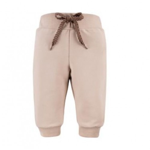 Mehke in udobne otroške hlače v bež barvi z dvema žepoma in okrasno vrvico. Hlače imajo patent in v pasu elastiko.