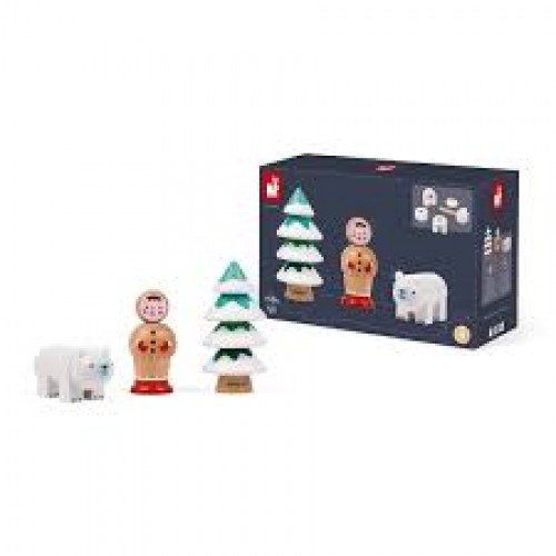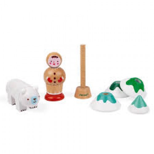 Ko bodo mali prstki vijačili ta tridelni komplet, bodo urili svoje fino motorične sposobnosti. Komplet je sestavljen iz treh arktično navdihnjenih likov s skupno 14 kosi, ki pomagajo razvijati otroško spretnost, ko bodo vsakega od kosov poskušali namestiti na pravi vijak. Ko so polarni medved, Inuit in jelka popolnoma sestavljeni, so odlični za uporabo v zimskih igrah vlog. Izdelani si iz trpežnega bukovega lesa.
