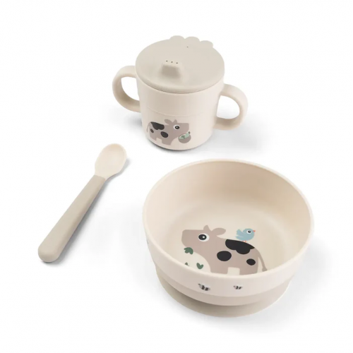 Žlička pa je ravno prave velikosti za prvo hranjenje. Ročaj žličke je idealen za oprijem malih prstkov pri prvem samostojnem hranjenju. Otroški jedilni set je zasnovan za vsakdanje življenje z otroki in je primeren za pomivanje v pomivalnem stroju in mikrovalovni pečici. Ko je jedilna posoda služila svojemu namenu na neštetih družinskih večerjah, jo je mogoče reciklirati v nove izdelke za vsakdanje življenje.
