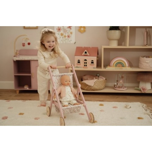 Bi danes peljali svojo punčko, fantka ali najljubšo plišasto igračko na sprehod? Očarljiv lesen otroški voziček blagovne znamke Little Dutch ima trden lepo obdelan okvir, lesena kolesa pa imajo gumijasto zaščito za lepšo vodljivost. Sedalni del je prekrit z romantičnim vzorcem rožic, kar daje vozičku očarljiv videz. Ne glede na to, ali se bo malček igral v zaprtih prostorih ali na prostem je neskončna zabava zagotovljena!