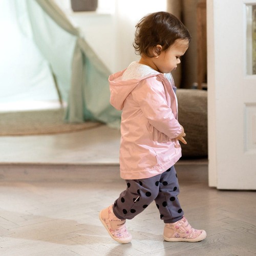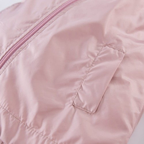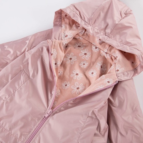 Jakna v roza barvi ima bombažno podlogo z motivom marjetic in se zapenja z zadrgo.
