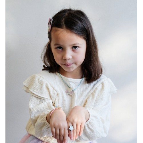Komplet Samorog vsebuje ogrlico, zapestnico in prstan s čudovitim samorogom in bleščečimi zvezdicami, izdelane iz mehkega materiala in bleščečih tkanin. Velikost kompleta je primerna za otroke od 3 do 10 let.