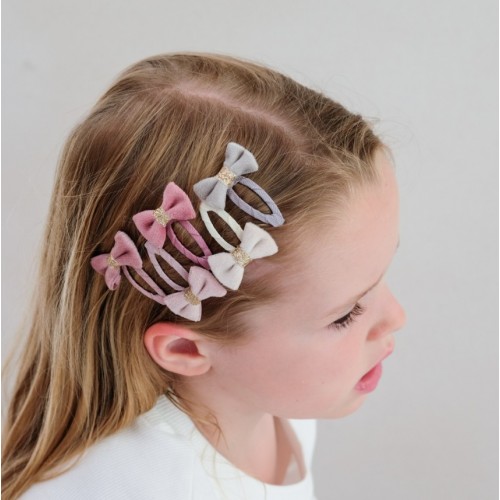 Vsebina: 5 špangic, ovitih s trakom in okrašenih z mehkimi žametnimi mašnicami v pastelnih barvah z bleščečimi na sredini