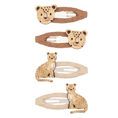 4 špangice z motivom leoparda bodo krasile pričesko vaše deklice. Špange so ovite s trakom, kar preprečuje cukanje.