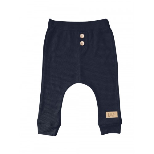 Udobne bombažne hlače v temno modri barvi z dvema lesenima gumbkoma za piko na i.