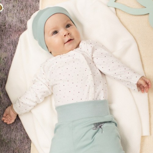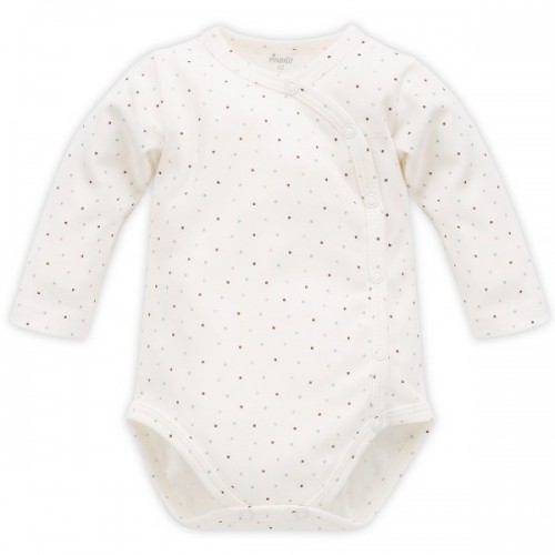 Bodi je v beli barvi s potiskom drobnih pisanih pikic.  Zapenja se po celi dolžini, kar olajša oblačenje in slačenje dojenčka.