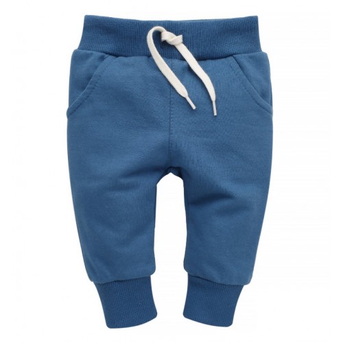 Udobne bombažne hlače v modri barvi s patentom, dvema žepoma in vrvico v pasu.