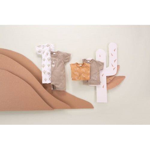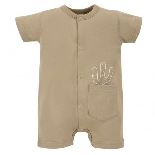 Simpatičen poletni pajac s kratkimi rokavi v olivni barvi s potiskom kaktusa, ki raste it prišitega žepka.