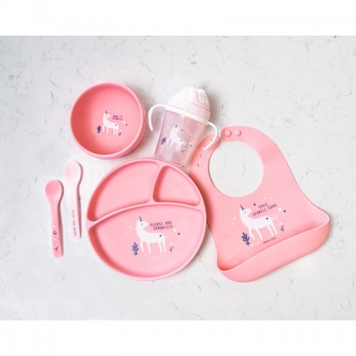 Malčki bodo uživali pri učenju samostojnega hranjenja, ko jih bo na dnu pozdravil ljubek samorog.