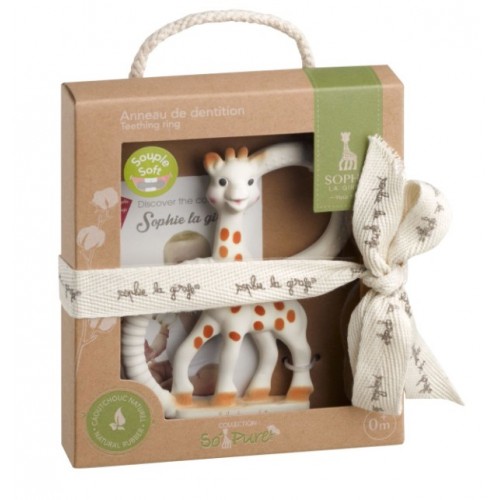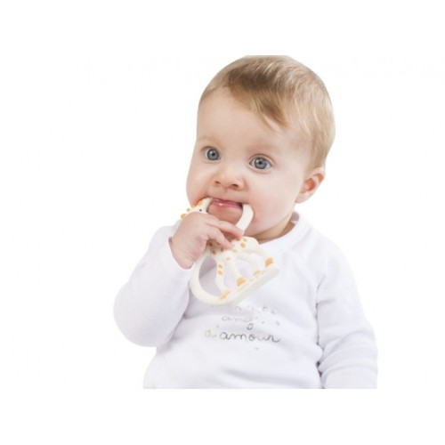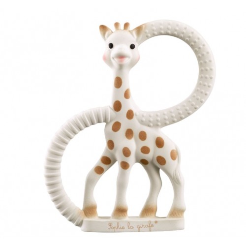 Obroček za grizenje žirafa Sophie ima 2 različni teksturi površine, med katerimi lahko otrok, glede na različno stopnjo rasti zob, instinktivno izbira in mu tako na najboljši način pomaga pri pomirjanju bolečih dlesni.