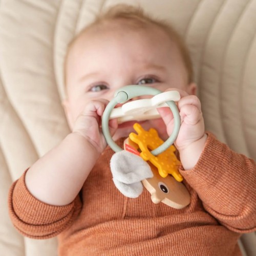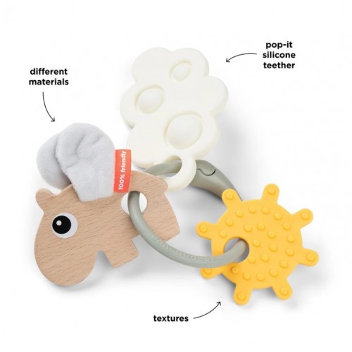 Aktivnostni obroček blagovne znamke Done by Deer spodbuja vse otrokove čute z različnimi teksturami, barvami in oblikami. Vključuje leseno figurico povodnega konja Ozza s tekstilnimi krili, ki oddajajo šumeči zvok, silikonsko grizalo v obliki oblaka s funkcijo ‘’pop it'', plastični sonček s posebno teksturo in obroček. Enostaven je za prijem malih rok ter spodbuja fine motorične spretnosti in koordinacijo roka in oči. Različne teksture so odlične za spodbujanje dlesni med izraščanjem zob. Stresite obroček in pustite, da zvok ropota spodbuja sluh vašega dojenčka.